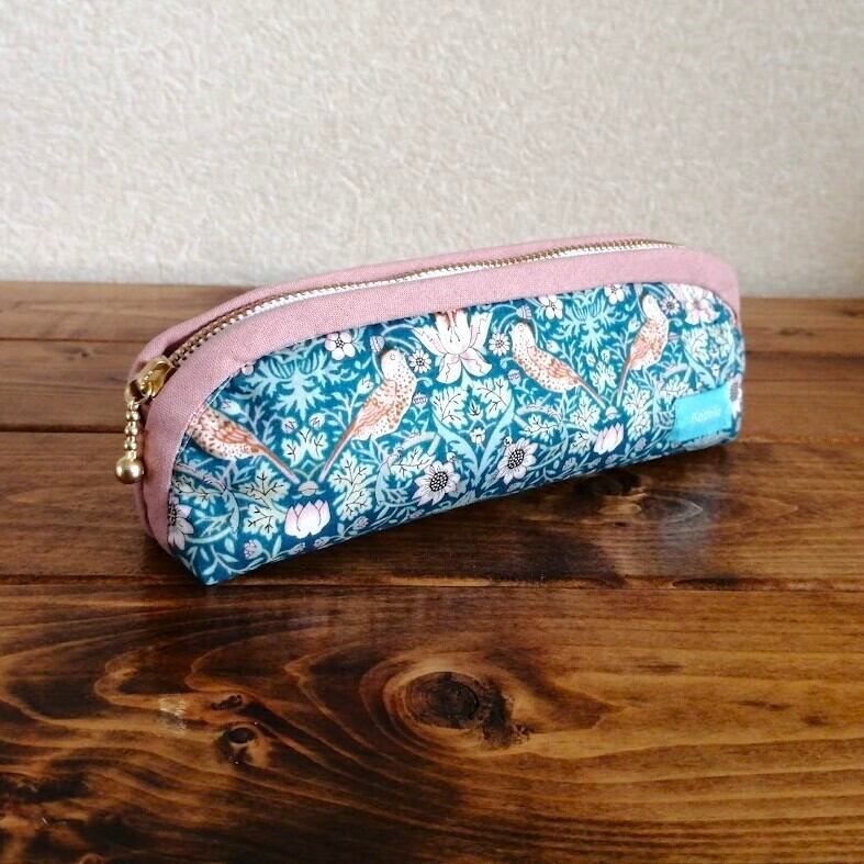 リバティ バイカラースリムポーチ <StrawberryThief>(ストロベリースィーフ)柄・緑×くすみピンク